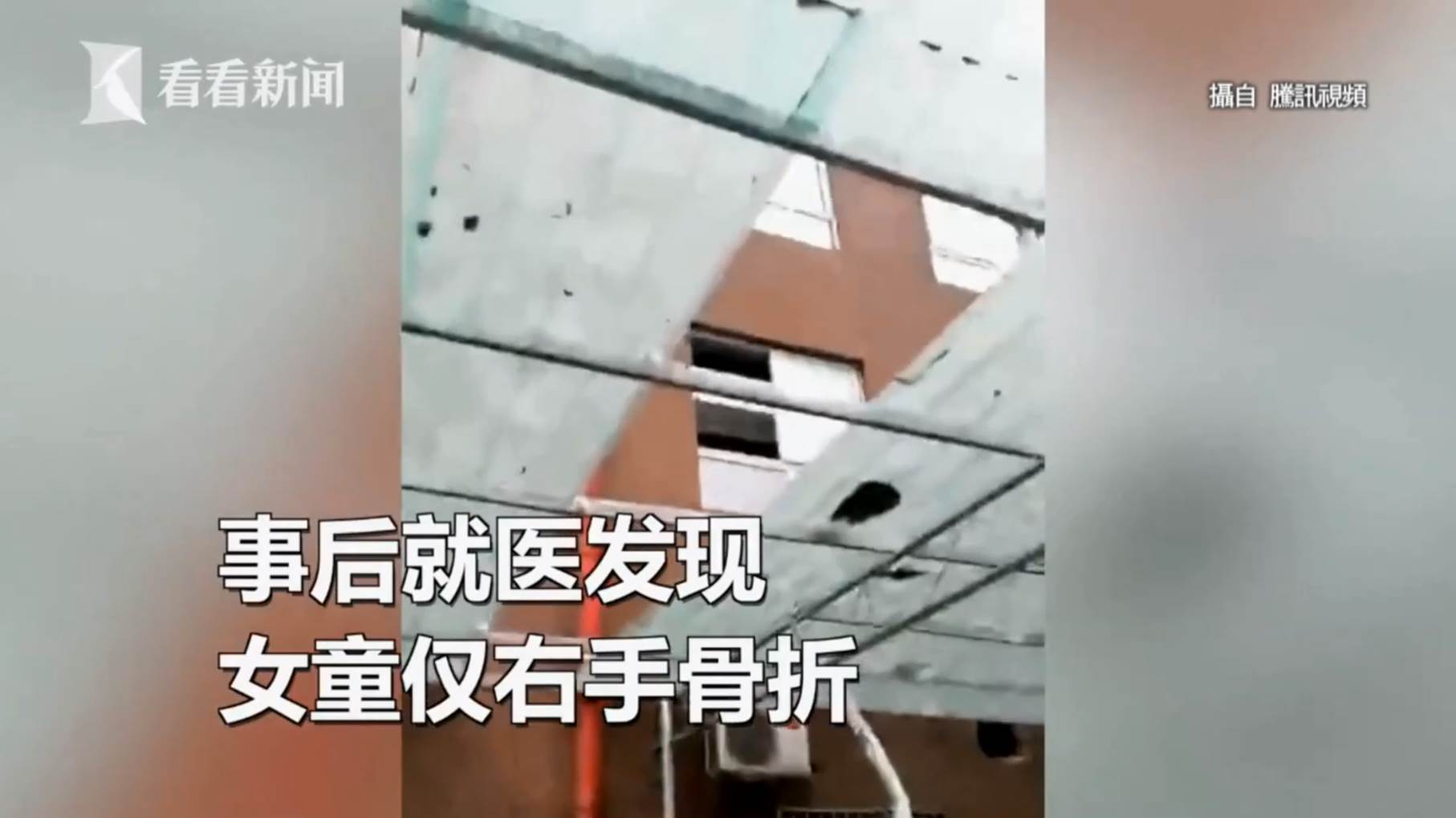 大陸新聞片段:「女孩落地後竟然自己爬了起來,原來是她墜落的時候,撞到了一個採光棚上。」
