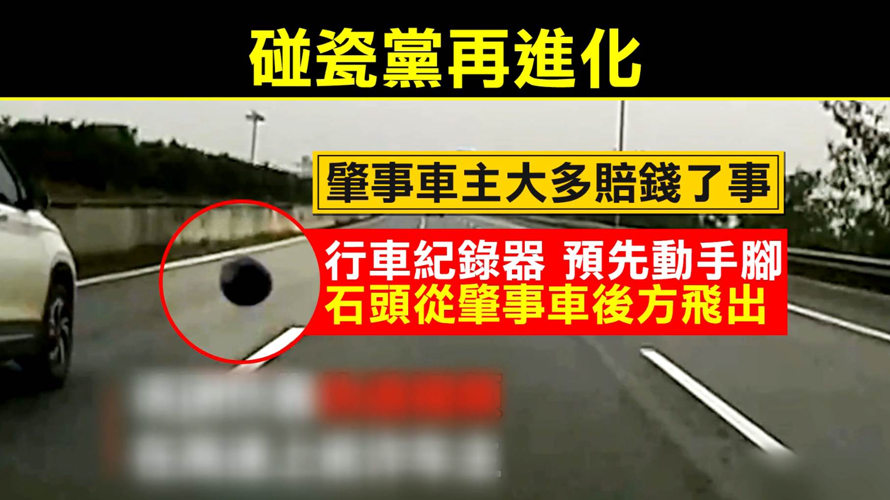 大陸碰瓷黨,又有新花招,高速公路上,碰瓷黨利用行車紀錄器犯案,他們開名車,專挑外地車、或是車上人較少的車輛下手,在尾隨的過程中,利用電腦合成軟體,模擬被害車輛,突然彈出石塊,砸中擋風玻璃,之後再進行索賠,因為手法特殊,引起大陸警方高度關注。