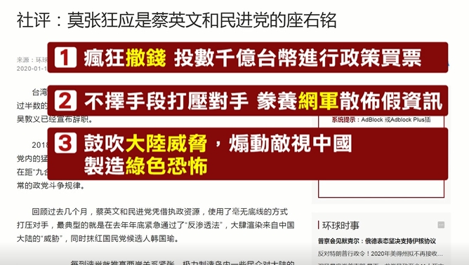 在大陸影響力極大的環球時報,也發出內容類似的報導,都提出三大點來批評蔡英文,認為他在選前瘋狂「撒錢」,投數千億台幣進行政策買票,而且不擇手段打壓對手,還養「網軍」來散佈假資訊,甚至還鼓吹「大陸威脅」,來煽動人民敵視大陸,製造「綠色恐怖」。