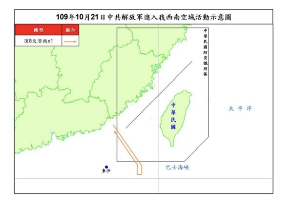 此外,還有10月11日運8反潛機1架次;10月15日運8反潛機1架次;10月16日運8反潛機1架次;10月17日運8反潛機1架次;10月20日1架空警500機、1架運9通信對抗機,以及1架運8反潛機;10月21日1架運8反潛機。