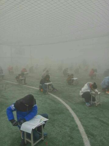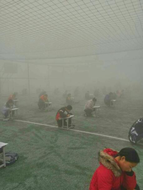 石家莊更測到PM10(懸浮微粒)和PM2.5(細懸浮微粒)雙雙破千,民眾還自嘲能得到金氏世界紀錄。現在許多大陸民眾都已經盡量避免出門,沒想到河南竟有學校校長讓學生在霾害中露天考試,幾乎看不見考卷!