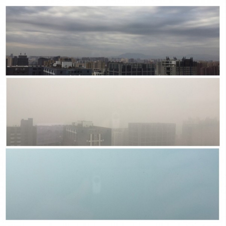 霧霾的恐怖,照片中可以看見原本霾害不嚴重時,雲朵和建築物都清晰可見,遠方的山巒也還看的到輪廓。沒想到霧霾來襲後只剩下建築物,最嚴重的第三張完全白茫茫一片,如墮五里霧中伸手不見五指。
