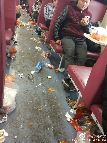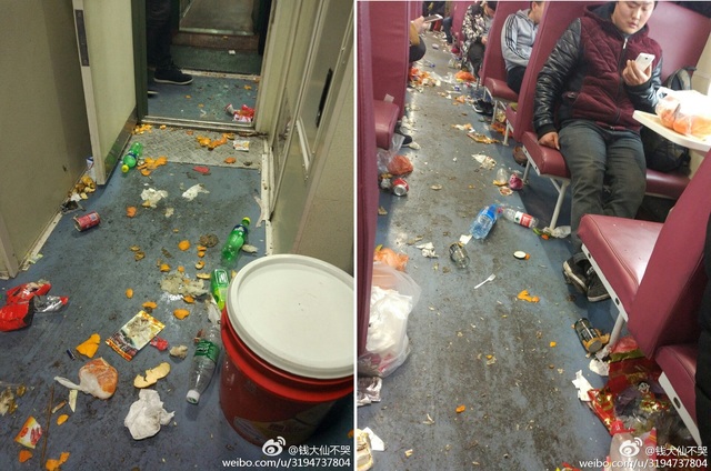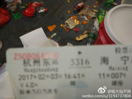 大陸網友「錢大仙不哭」日前在微博PO出一張照片指出,他2月3日買了杭州東到海寧的火車票,上車以後發現滿地都是垃圾,且地板都是黑色污漬,一處乾淨的地方都沒有。PO文被轉載到大陸論壇「貓撲」(mop)後,許多大陸網友都表示:「河南人坐過的火車」、「這是火車?妳開玩笑」、「我的天啊,好髒」、「拉過豬的火車」。