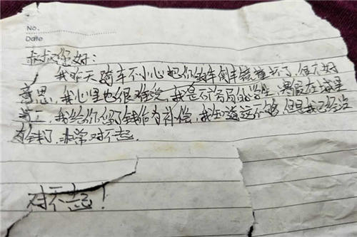 學生不僅沒有逃逸,還留下親手寫的道歉信,以及寒假打工僅存的311元人民幣(約1406元新台幣)做為補償。這不僅讓原本火冒三丈的車主怒氣全消,還大為感動想資助這位誠實負責的學生完成學業!