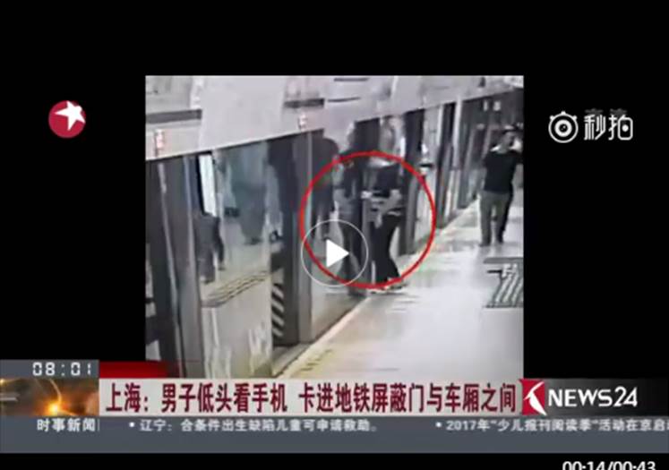 滑手機,不知道是坐過站還是坐錯車,倉皇逃出後,結果不慎被卡在車門和安全門的隙縫間,在場的人都傻眼了。