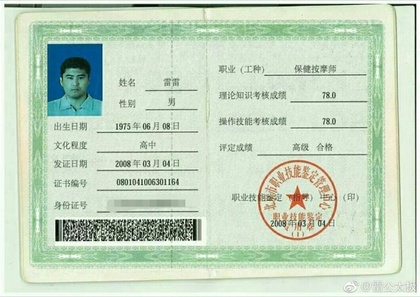 魏雷曾在「雷公太極」微博PO文,聲稱自己已經40歲仍可以臥推100公斤,儘管擁有20年的健身經驗,不過,他認為健身不能做一輩子,並秀出高級保健按摩師證書。這張「高級保健按摩師」,於2008年3月4日發照,上面也顯示了他的教育程度為高中。
