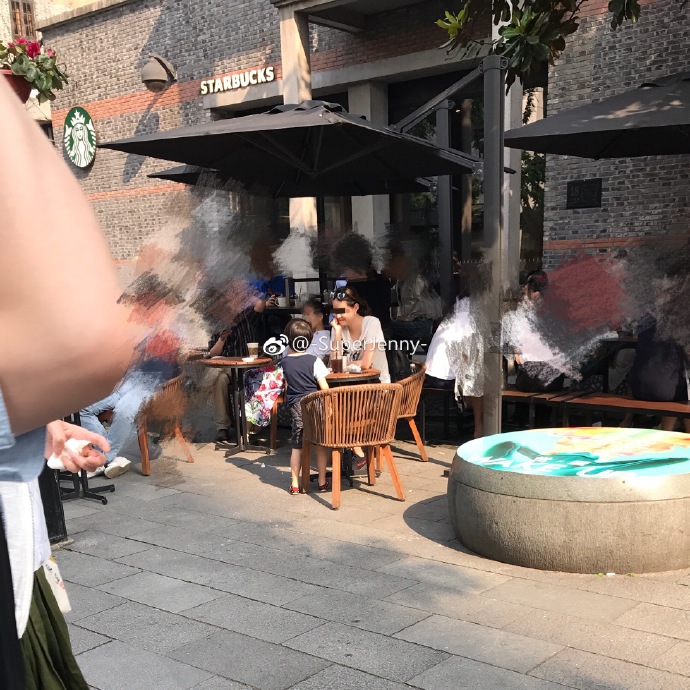 馬路旁的行道樹撒尿。媽媽還坐在一旁星巴克露天咖啡座喝咖啡,還對小孩鼓掌大讚「寶貝你好棒!」。
