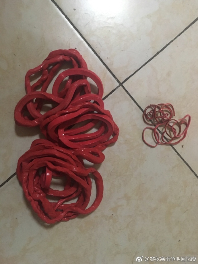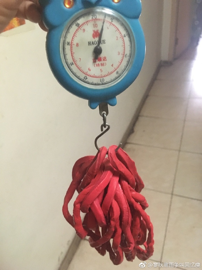 網友驚覺自己可能被店家坑,所以拿出秤子來量,果然這18條大橡皮筋共達一斤重,等於他所花的兩千多元裡面,竟然有6百多塊花在橡皮筋上!讓他怒批店家「坑騙消費者呢?有小皮筋還要绑大皮筋?」