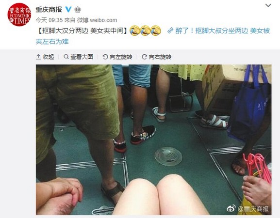 據《重慶商報》報導,程女在16日下午4點半時搭乘地鐵,中間陸續有乘客上下車,後來在某站湧入許多乘客,車上瞬間擠滿人潮,而她的身旁正好有兩名男子坐了下來,但沒想到右邊的中年男子竟然在坐下之後,立馬把鞋子脫掉,光著腳丫子踩在隨身攜帶的塑膠桶上。