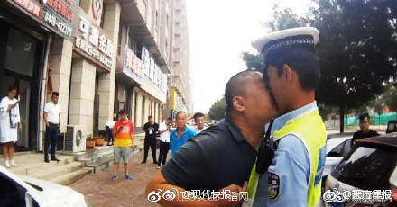 鼻咚」,嘴唇也湊了上去,警察就這樣被強迫親密接觸,原本火爆的氣氛瞬間變得十分曖昧,一旁的路人也看傻了眼,後面的阿伯更抬起頭來,驚愕的看著他們。