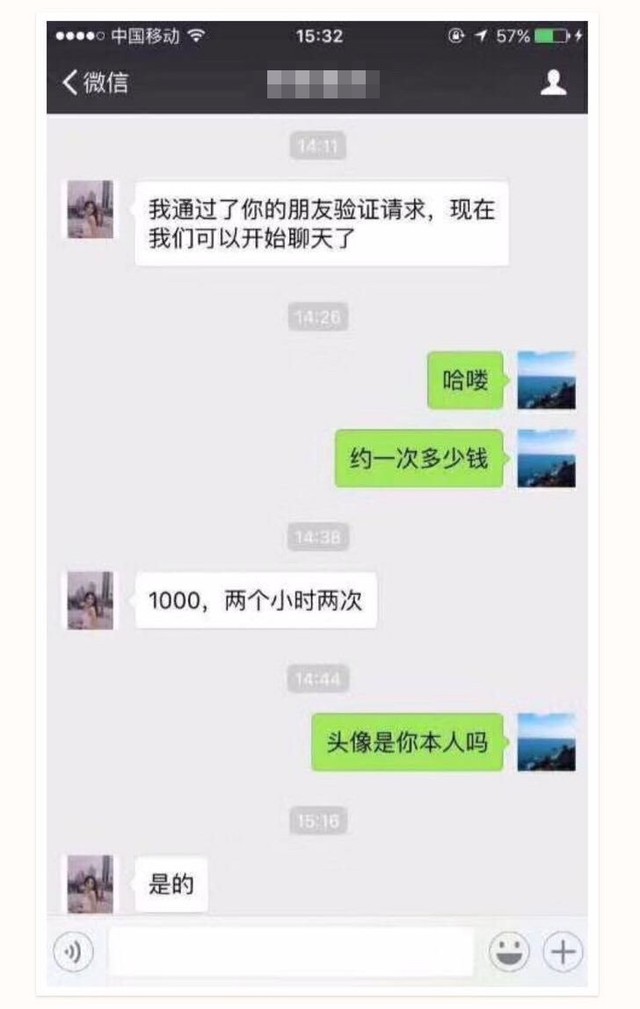 大陸一名男性網友表示,他透過微信認識了一位外型亮眼、身材姣好的年輕援交正妹,簡直就是女神等級,因此想要和對方玩一下,於是男子開出了人民幣1000元(約新台幣4500元)的價碼與對方進行2小時2次的性行為,對方也答應男子的要求。見面當天,這名男子按照約定開車前往指定地點接援交妹時,才驚覺援交妹的身形與照片中的樣子有極大落差,讓他不禁質疑對方「頭像是您本人嗎?」由於實在是差很大,男子開始懷疑自己是遭到修圖集團