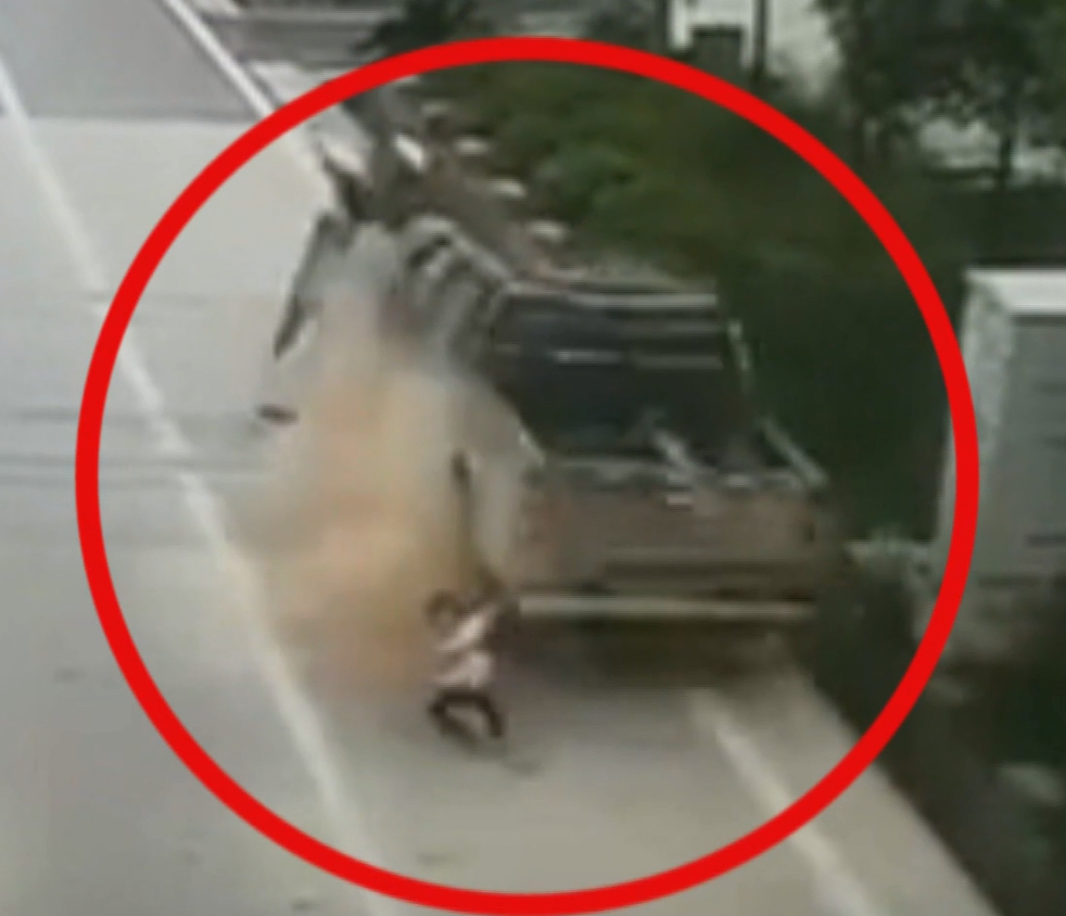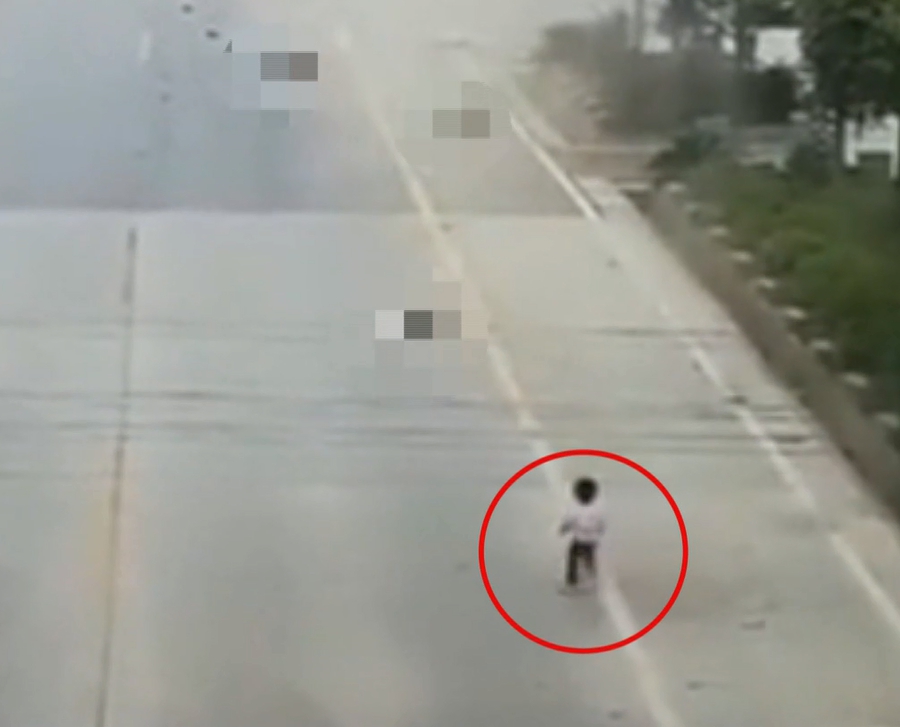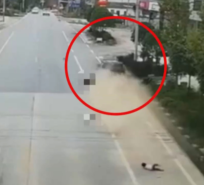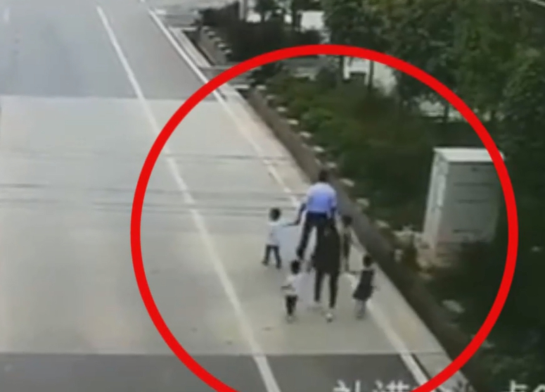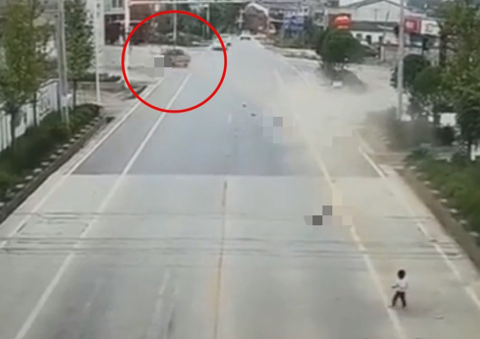 倖存的孩童,走在眾人的左後方,肇事的車輛剛好跟他擦身而過,跌倒後只見孩童自行爬起,並一臉無助的走向慘遭撞飛的家人身邊,整個畫面令人不勝唏噓。