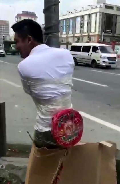 無獨有偶,大陸廣州一名新郎在大喜之日被綁在路燈上,慘遭鞭炮「爆菊」,褲子滲出鮮血,還有一名