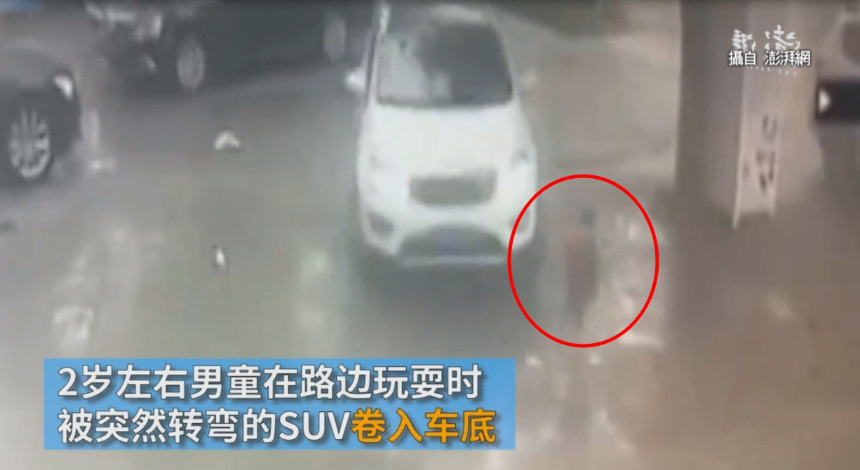 透過監視錄影畫面,可以看到白色汽車轉彎時疑似被柱子擋住視線,行駛過程中沒有煞車,直接將在路邊玩耍的2歲男童捲入車底,男童遭到車子輾過後不到幾秒,居然自行站起來跑回家。