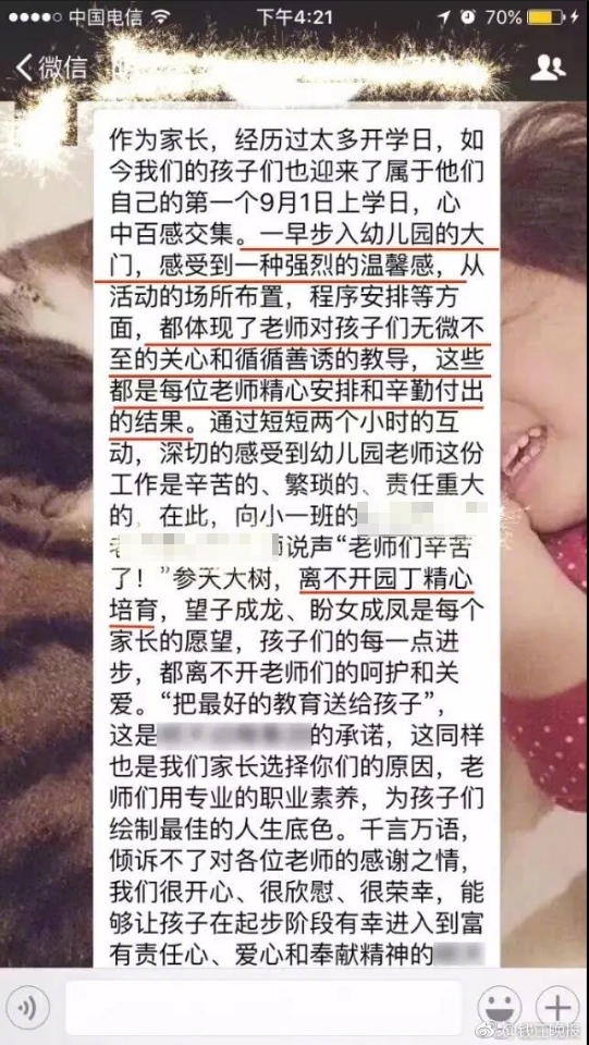根據陸媒報導,有老師在開學後把學生家長加進微信群組,有家長馬上歌功頌德要討好老師,寫到「一早步入幼兒園大門,感受到一種強烈的溫馨感,從活動的場所布置、程序安排等方面,都體現了老師對孩子無微不至的關心和循循善誘的教導,這些都是每位老師精心安排和辛勤付出的結果」、「孩子們的每一點進步,都離不開老師們的呵護和關愛」、「千言萬語傾訴不了對各位老師的感謝之情」。