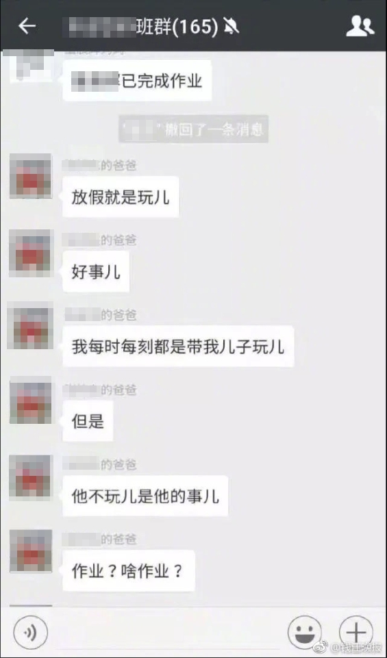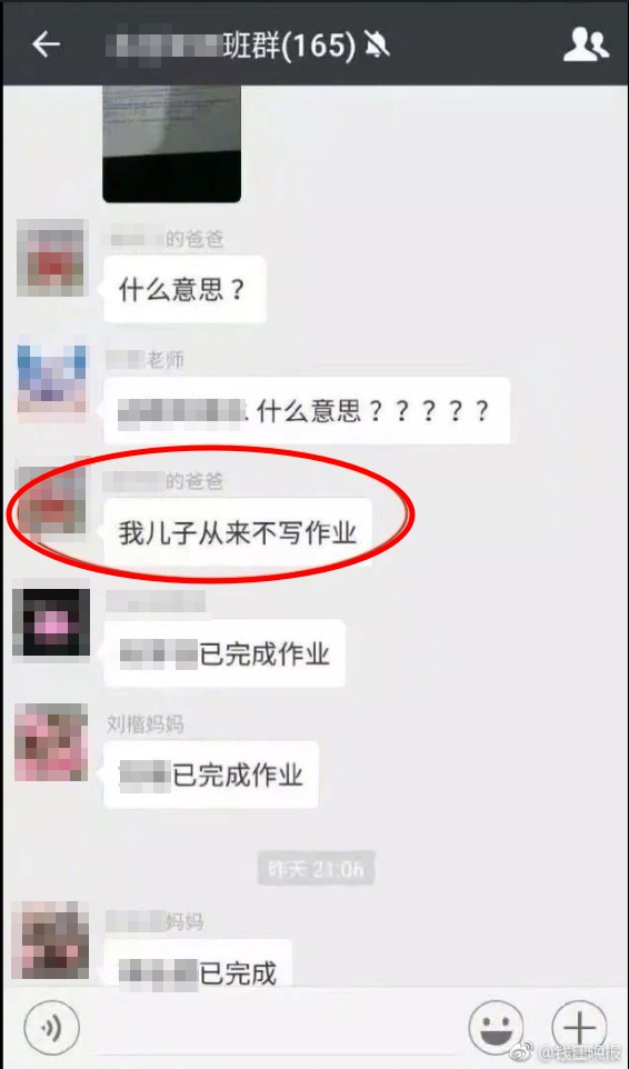 群組裡說:「我兒子從來不寫作業」。(圖/翻攝自錢江晚報微博)