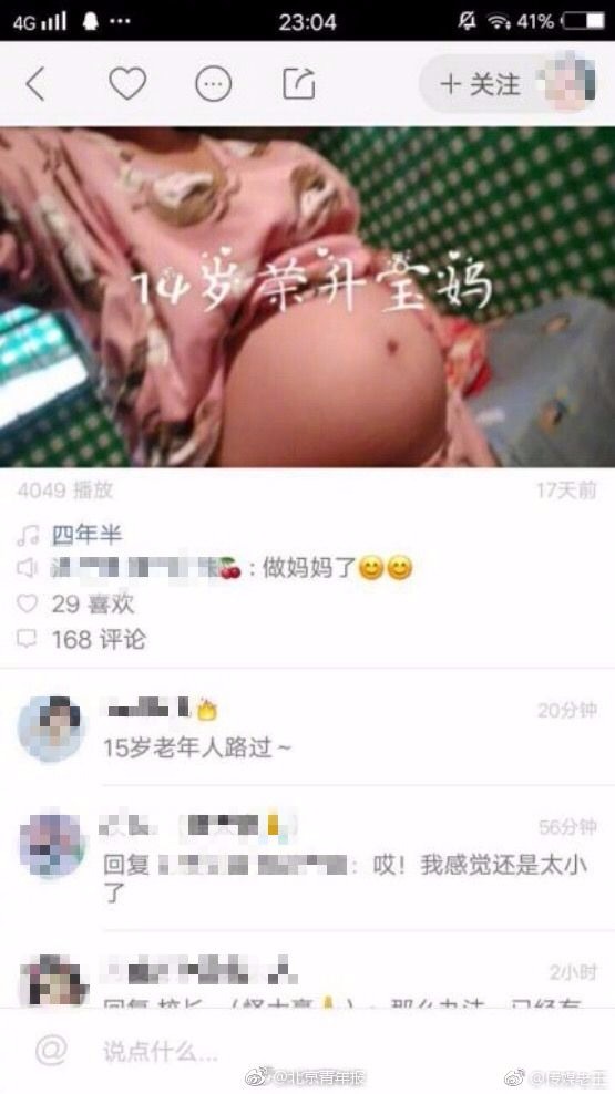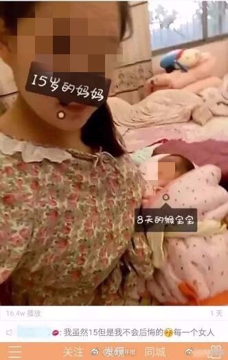 據陸媒《北京青年報》報導,一名網友30日在微博發文,表示他在網路平台「快手」瀏覽影片時,竟看見一名14歲女孩挺著大肚子拍攝影片,更喜悅表示「做媽媽了」,未料更令他吃驚的是,這竟不是單一個案,不但有未婚媽媽回應,平台上也有不少18歲以下的少女曬出懷孕影片。