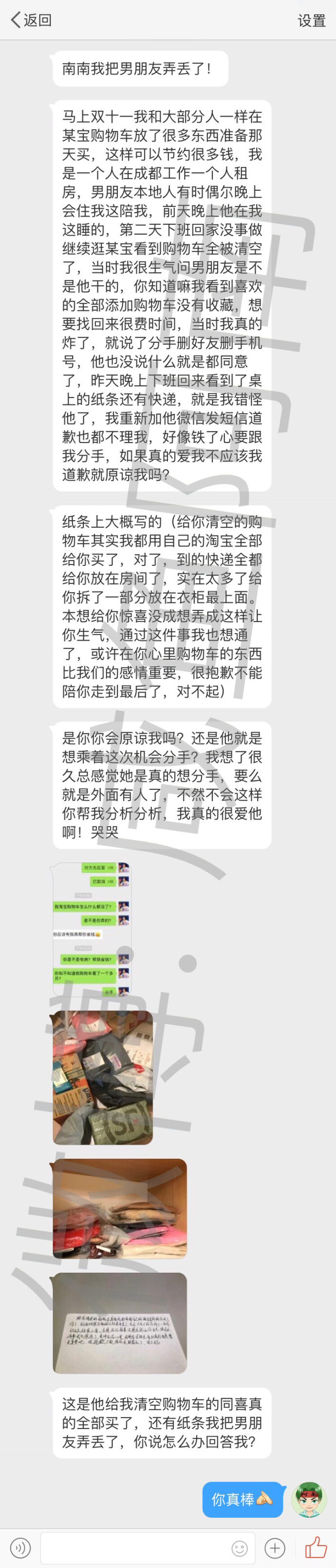 大陸一名女子向微博知名搞笑博主「鹹魚阿南」求救,說自己「把男朋友弄丟了!」,這名女子解釋,前陣子她放了很多商品到購物車內,想說在雙11購物節當天一次買,就可以省下不少錢。而前幾天她的男友來家裡陪她過夜,沒想到第二天下班回家,正想要繼續逛購物網站時,卻發現她累積許久的購物車清單全被刪掉了。