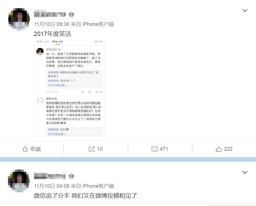 而這篇貼文原本是匿名的投稿,卻因為討論聲浪太熱烈,把兩位事主都給引了出來,男方還在自己的微博貼文,「微信說了分手,我們又在微博投稿相見了」,看到女方留言的說法後,更是不屑地稱是「2017年度笑話」,看來兩人是不太可能復合了。