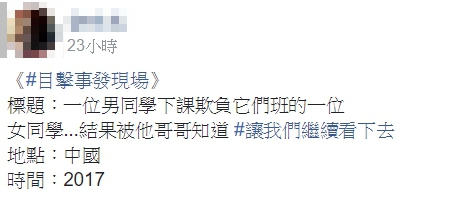《爆料公社》放上一段影片,並以以《目擊事發現場》為題發文,指出有大陸一位男同學在下課後,欺負班上一位女同學,結果被女同學的哥哥知道了,哥哥馬上「烙人」去痛毆那位男同學。