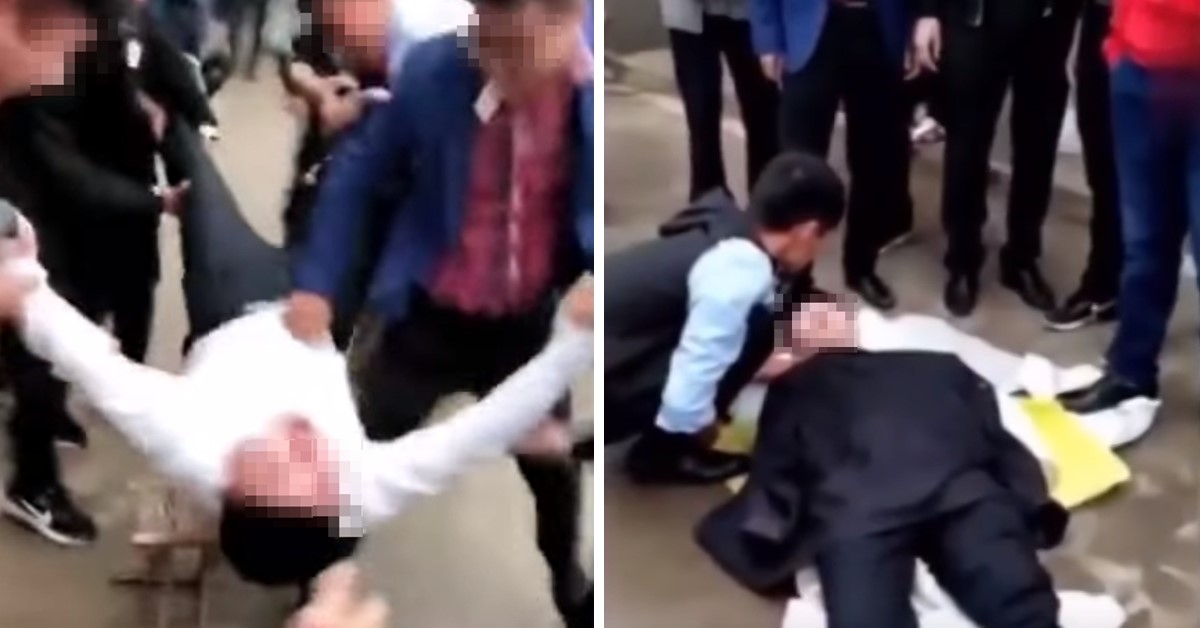 ▼伴郎頭部猛力撞擊地面,一度躺在地上昏迷不醒。(圖/翻攝自梨視頻)