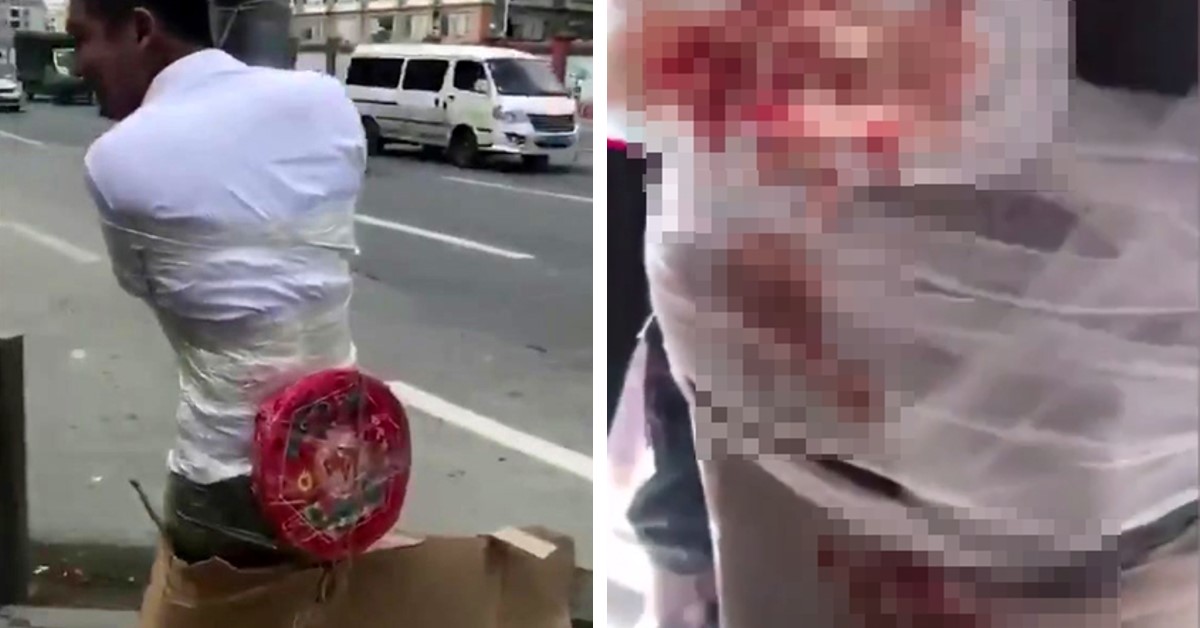 ▼新郎被五花大綁,屁股被掛上一長串鞭炮。(圖/翻攝自梨視頻)