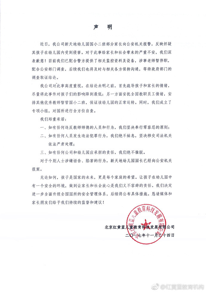 ▼ 紅黃藍幼稚園聲明稿。(圖/翻攝自「紅黃藍教育機構」微博)