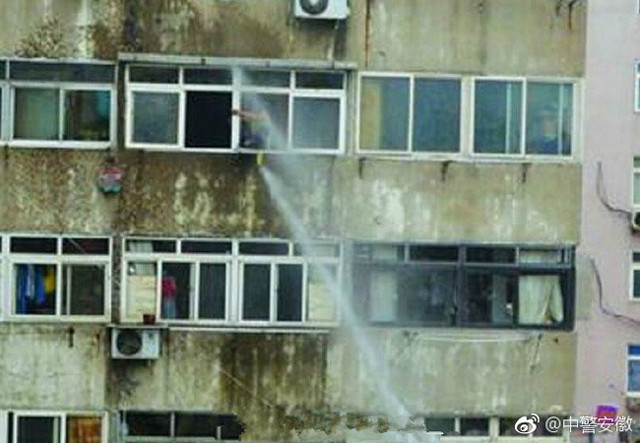 水柱,朝男子臉上狂射,逼得男子只好躲回屋內閃避水柱,順利阻止悲劇發生。男子隨後也被帶回派出所調查。