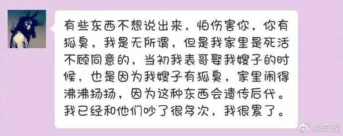 男網友表示,「不是嫌棄你,是家裡人為後代著想;不是要聞腋下,第一次見面,妳坐進車裡就聞到了,很大味」,並強調只是為了下一代著想,雖然自己無所謂,但是家裡的人的無法接受,他還舉出自己表哥的例子,「我表哥娶我嫂子的時候,也是因為我嫂子有狐臭,家裡鬧得沸沸揚揚,因為這種東西會遺傳後代」。這樣的指控讓「小姐姐」很自卑,但是她問遍身邊所有人,都沒人聞到狐臭,也讓她心中產生大大的問號。