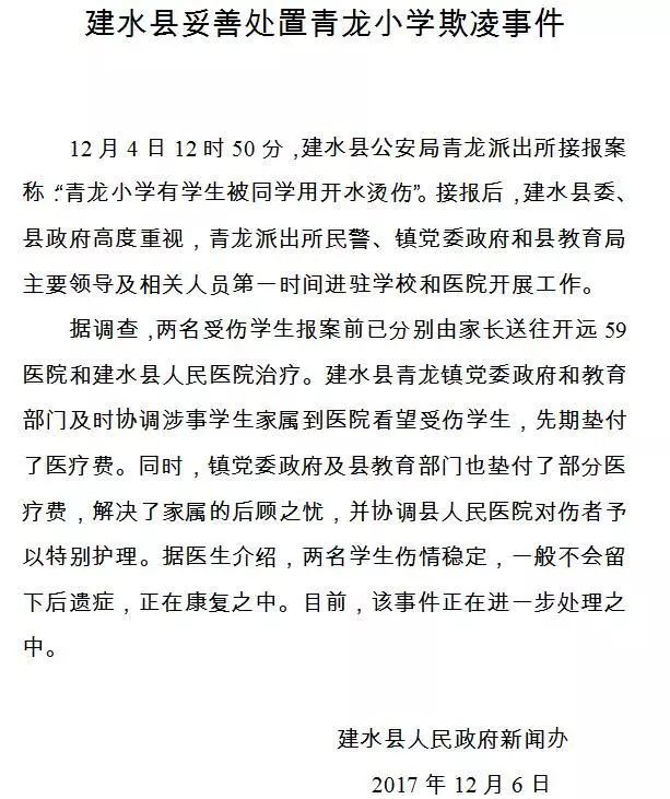 2位受虐男童送醫檢查後,發現下體、左右大腿內側、腰部都有大面積燙傷,而且皮膚大片脫落,露出鮮紅色的肉,傷口邊緣還不斷滲血,更有皮膚被燙到發黑,在家長心急追問之下,2位受虐男童才吞吞吐吐說出實情,坦承遭到5位同學毆打,綁住手腳,有人用枕頭壓住頭部,其他人則脫下他們的褲子用滾水凌虐。其中一名男童咬緊牙齒,哭著向母親說,「媽媽你不要送我讀書了,你別讓那些人來打我、欺負我」。