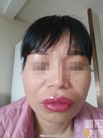 ▼張婦繡完唇卻變成「香腸嘴」。(圖/翻攝自西安城事兒微博)