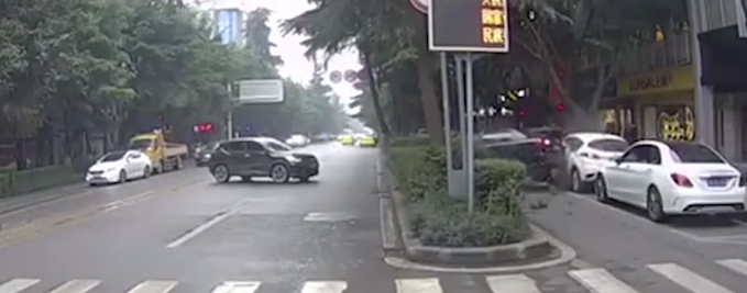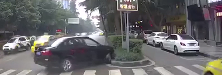 狂!中國大陸重慶一名女性駕駛,在開車時為了拿起電話,竟將煞車誤踩成「油門」,先是來個180度大迴轉