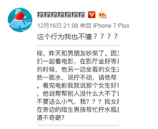 「粽粽粽粽粽粽粽」轉PO一名女網友向他訴苦的內容,並一同表示「這個行為我也不懂」。據原PO截下來的對話顯示,這名女網友原本和男友開心地去看電影,後來坐在一旁的陌生女子因打不開瓶子瓶蓋,而轉向找她的男友幫忙擰開。但電影散場後,女網友越想越不對勁,認為對方找上一個已經有女友的男子,幫忙擰瓶蓋的舉動很「