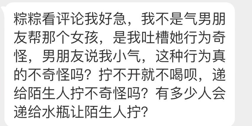 一個單純的「打開瓶蓋」事件,沒想到引起這麼多網友議論紛紛,讓該名女網友再次出面澄清,自己不是氣男友幫忙女子,而是「吐槽她的行為奇怪」,卻沒想男友說她小氣,「這種行為真的不奇怪嗎?擰不開就不喝唄,遞給陌生人擰不奇怪嗎?有人會遞給陌生人擰?」