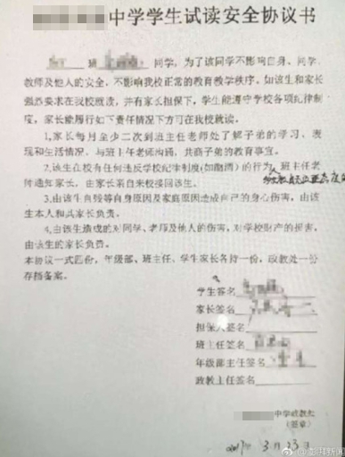 ▼小凱在宿舍自殘後,校方今年3月就和家長協定小凱自殘行為由他自行負責(圖/翻攝自澎湃新聞微博)