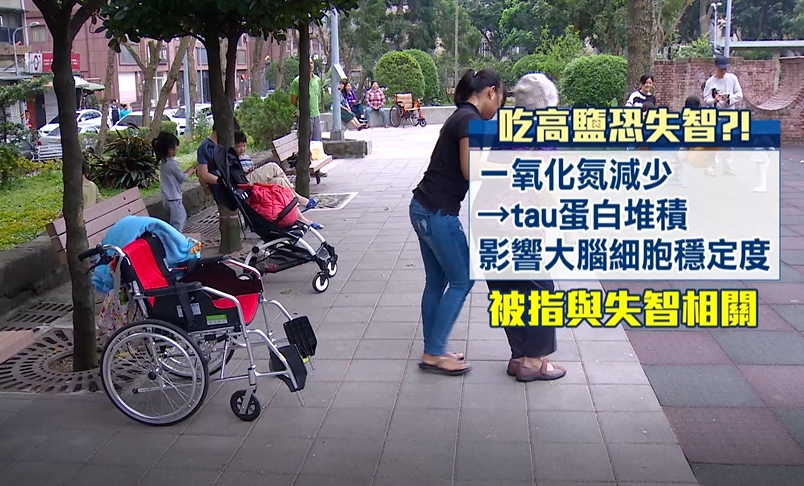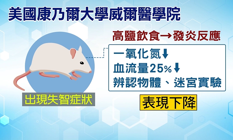 美國的康乃爾大學研究則指出,高鹽飲食會促進發炎反應,導致老鼠出現失智症,甚至會造成腦中的一氧化氮減少,血流量下降25%,辨認物體以及迷宮實驗表現都會下降,其中一氧化氮減少,導致腦神經中的TAU蛋白堆積過度堆積,就會影響大腦細胞的穩定度,過去就被視為是和失智症有關。