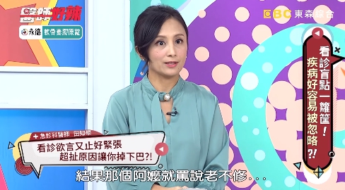 急診科醫師田知學在東森節目《醫師好辣》分享醫病經驗,她透露曾遇過一對7、80歲的老夫妻,先生推著太太進來,表示她上廁所會痛、下面也怪怪的,還相當頻尿,不過她發現老先生一直欲言又止,一旁的老婆還不停狠瞪老公,讓她感到十分疑惑。