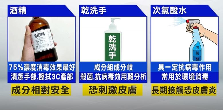 把市面上清潔消毒產品比一比,75%濃度酒精,消毒效果最好,可用來清潔手部、擦拭3C產部,成分相對安全,乾洗手因為成分組成分岐,殺菌、抗病毒效用較難分析,若含有三氯沙成份,還有刺激皮膚風險,次氯酸水雖然具有一定抗病毒作用,但常用於環境消毒,長期接觸恐怕會造成皮膚炎。
