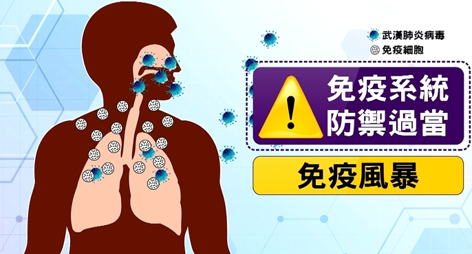 台中榮總免疫風濕科主任黃文男:「身體其實在面臨全新的病毒的時候,他就會很錯亂,他以為是一個非常強的病原體,它會引發非常厲害的免疫反應,我們就稱之為免疫風暴,就講說我們的免疫像發瘋一樣,它會產生非常多發炎物質去攻擊自己身體。」