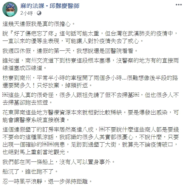 麻醉科醫師邱豑慶在粉專《麻的法課 - 邱豑慶醫師》發文表示,連假4天好擔心台灣民眾會「好了傷疤忘了疼」,「因為台灣在武這波漢肺炎的疫情中,一直保持優等生的表現,可能讓人對於疫情失去了戒心。」