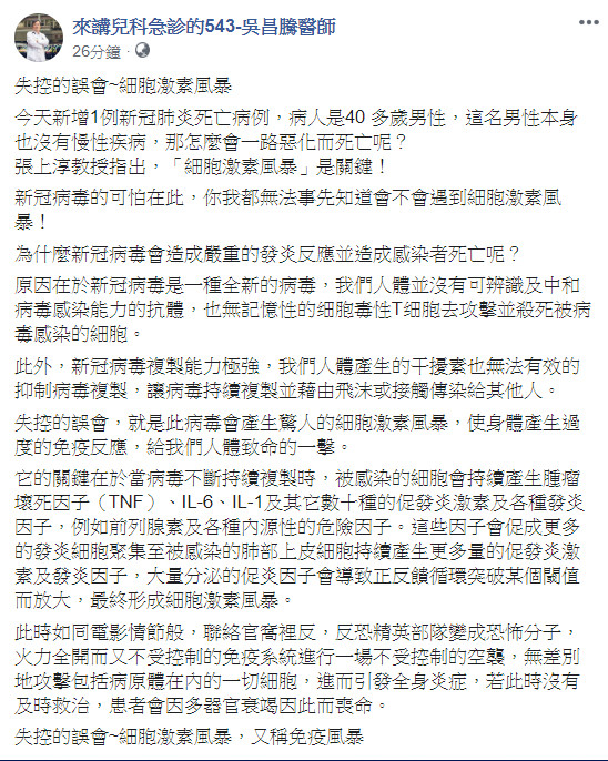 ▼醫師吳昌騰在臉書解說,何謂「細胞激素風暴」。(圖/翻攝自 來講兒科急診的543-吳昌騰醫師臉書)