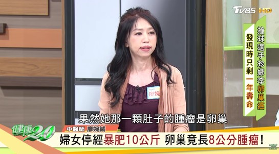 中醫師廖婉絨在節目《健康2.0》中分享,曾經有位58歲的婦女來找她減重,她表示自己55歲才停經,但3年內卻突然暴增10公斤,而且都集中在肚子,結果醫師觸診時,發現婦女肚子內感覺有硬塊,不像一般人肚子軟軟的,建議她趕緊做婦科超音波檢查,果真在肚子內發現8公分左右的腫瘤,為第三期卵巢癌,必須整個切除。