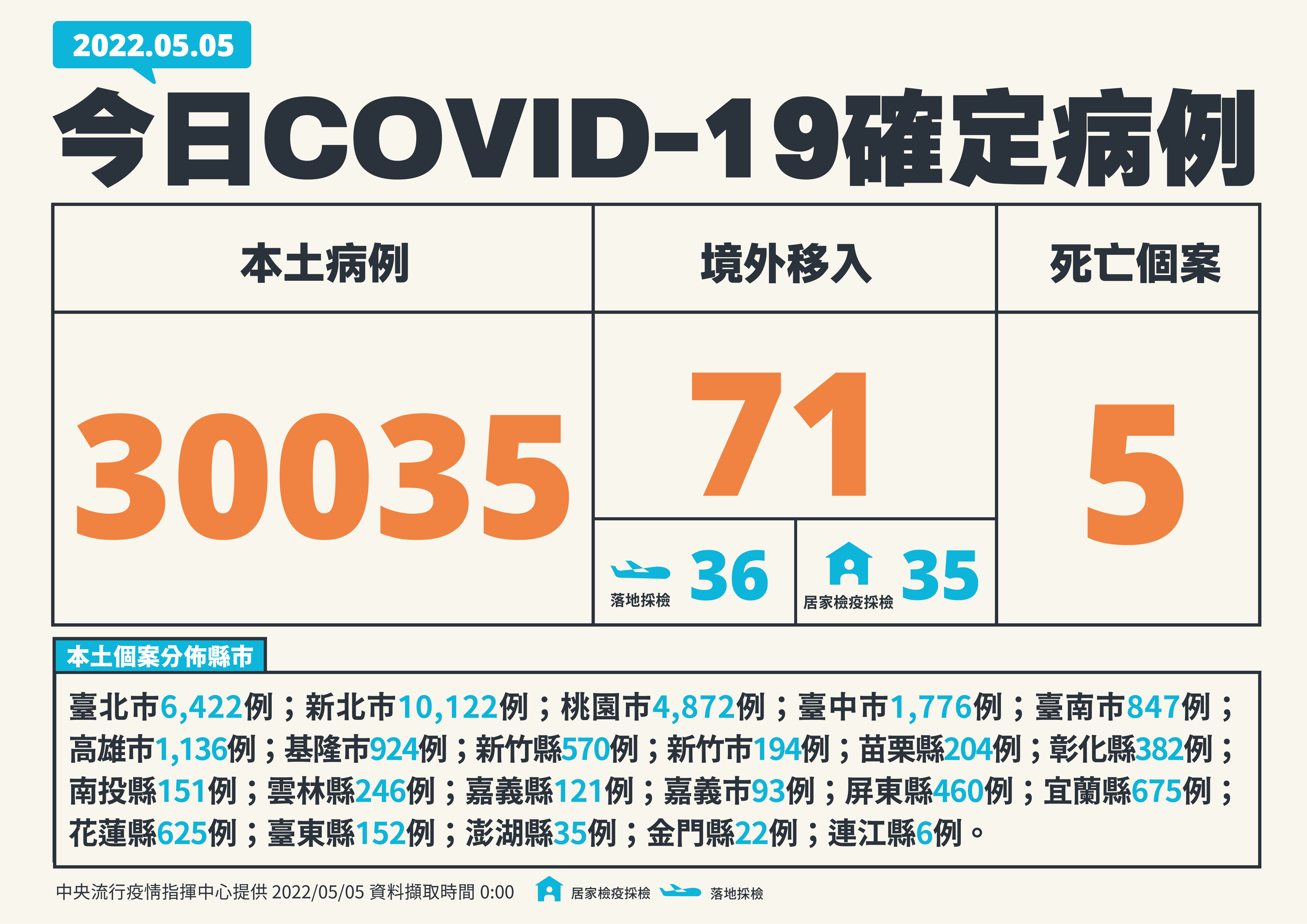 另外,今日疫情部分,今日新增之30035例本土病例,為14634例男性、15386例女性、15例調查中,年齡介於未滿5歲至90歲以上,個案分布為新北市(10,122例)、臺北市(6,422例)、桃園市(4,872例)、臺中市(1,776例)、高雄市(1,136例)、基隆市(924例)、臺南市(847例)、宜蘭縣(675例)、花蓮縣(625例)、新竹縣(570例)、屏東縣(460例)、彰化縣(382例)、雲林縣(246例)、苗栗縣(204例)、新竹市(194例)、臺東縣(152例)、南投縣(151例)、嘉義縣(121例)、嘉義市(93例)、澎湖縣(35例)、金門縣(22例)、連江縣(6例),相關疫情調查持續進行中。
