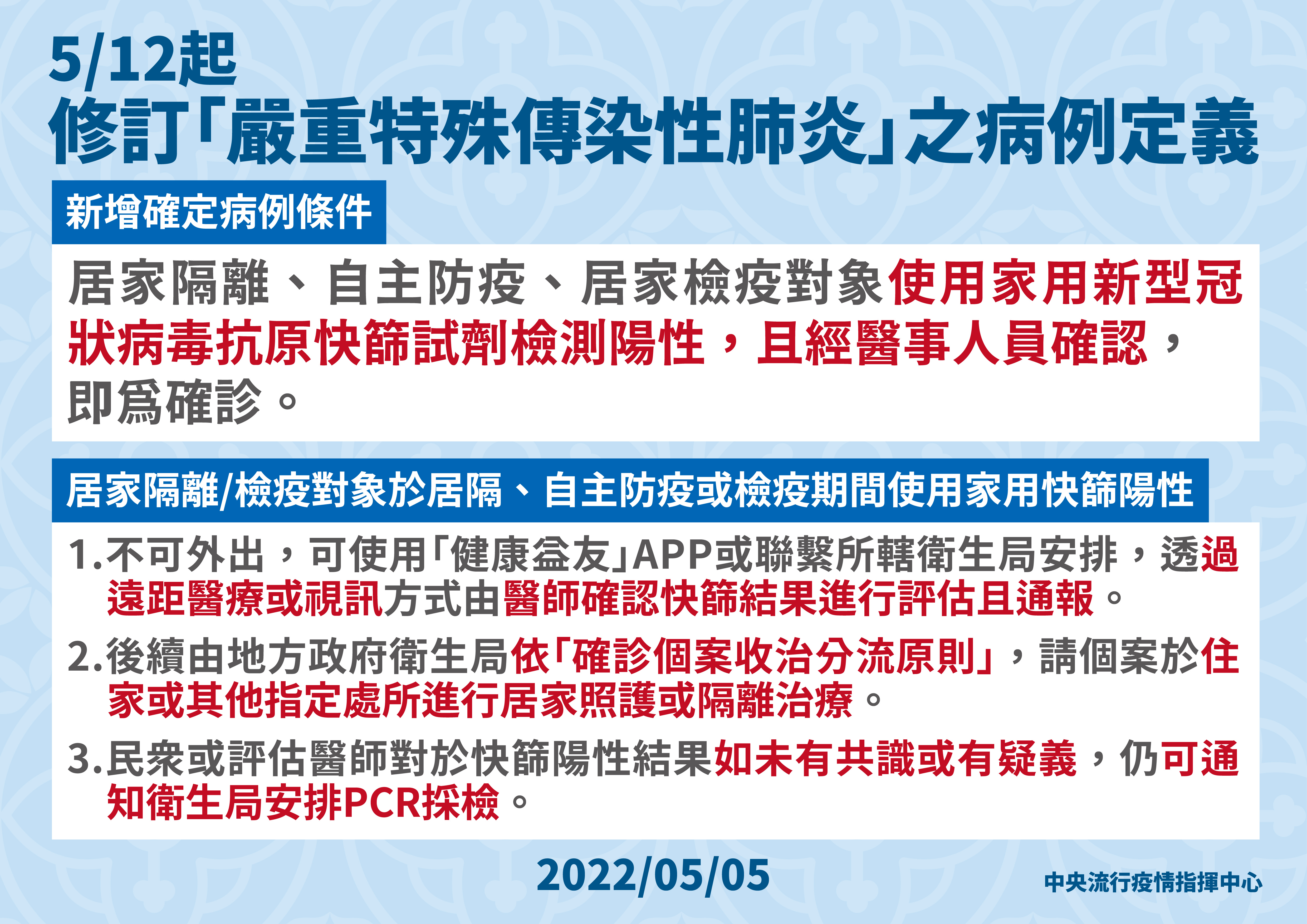 近日台灣疫情大爆發,連續多日本土個案破萬,今(5)日新增30035例本土病例,另增5人死亡。為了因應越來越多的病患,指揮中心宣布修訂「嚴重特殊傳染性肺炎」病例定義,三大族群只要使用家用快篩檢測陽性,並符合一條件,就認定為確診個案。