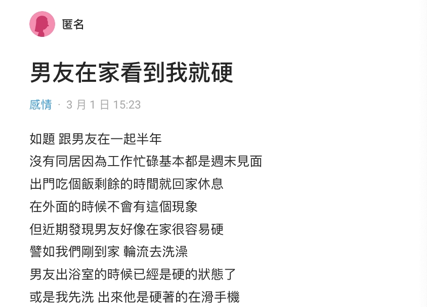 該名女網友在知名論壇「Dcard」,以「男友在家看到我就硬」為題發文,表示自己和男友交往半年,兩人沒有同居,基本上都是在週末才見面,然而她最近發現,男友在家裡很容易產生生理反應,比如說兩人輪流洗澡,他剛剛出浴室就會出現生理反應,有時只是輕輕抱一下,對方也會立刻反應過度,這讓她感到非常驚訝,因為在外面的時候他卻不會有這樣的情況。