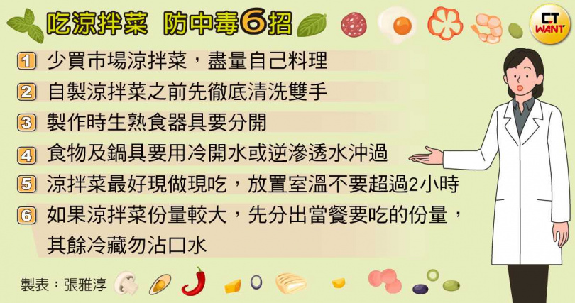 營養師程涵宇表示,涼拌菜雖然吃來爽脆美味,但一不小心卻可能造成食物中毒。「因為涼拌菜大多是生食,沒有經過高溫烹調的殺菌步驟,再加上夏天氣候濕熱,若沒有及時冷藏容易滋生微生物、細菌,所以食物中毒的風險就比較高。」