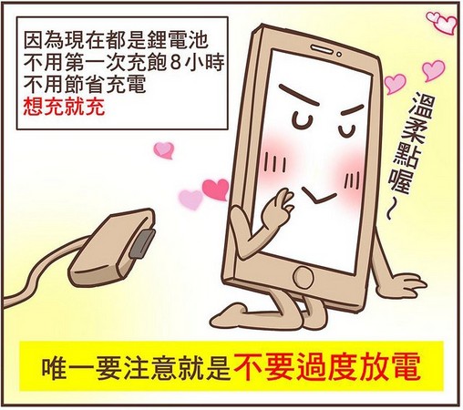 很多網路上的訊息會說,「手機買回來要充滿8小時」,那是因為以前得手機使用的是鎳氫電池,所以才會有這樣的說法,現在的鋰電池幾乎沒有記憶效應,因此不需要太擔心。