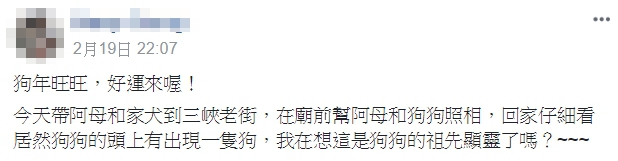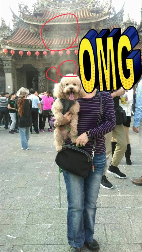 爆廢公社」PO出一張媽媽與愛犬的合照並示,19日在三峽祖師廟前拍照,回家查看照片時,赫然發現照片中竟出現了奇怪的殘影,讓她覺得相當不可思議。從照片中可看見,原PO的媽媽右手抱著貴賓狗,站在廟門口前方留下合影,貴賓狗還伸出舌頭看著鏡頭,超萌的模樣令人會心一笑,但仔細一看卻會發現狗狗的頭上方浮現如同黃金獵犬、西施犬的般殘影,讓原PO感到不可置信,直呼「是狗狗的祖先顯靈了嗎」?