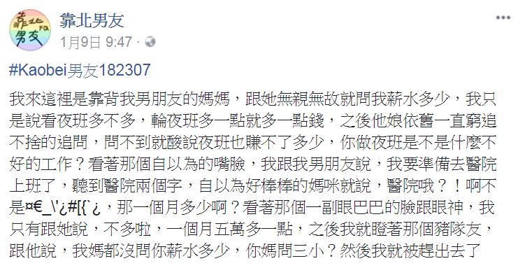 一名女網友在臉書《靠北男友》發文抱怨,男友的媽媽老是想問她薪水多少,原PO原本只是想隨意回答,就說「看夜班多不多,輪夜班多一點就多一點錢」,沒想到男友媽媽卻窮追不捨,問不到竟然就酸溜溜地說:「夜班也賺不了多少,你做夜班是不是什麼不好的工作?」