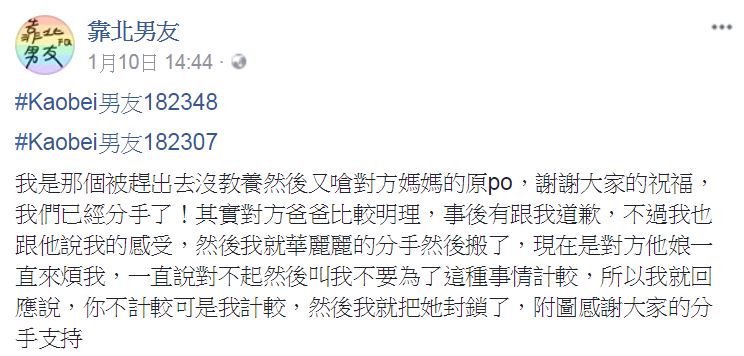 事後原PO透露,她和男友在這件事情過後就分手了,對方的爸爸相對比較明理,有去瞭解她的感受並且道歉,而男友的媽媽則是懊悔地一直和原PO道歉求原諒,還叫她不要為了這種事情計較,「所以我就回應說,你不計較可是我計較,然後我就把她封鎖了。」